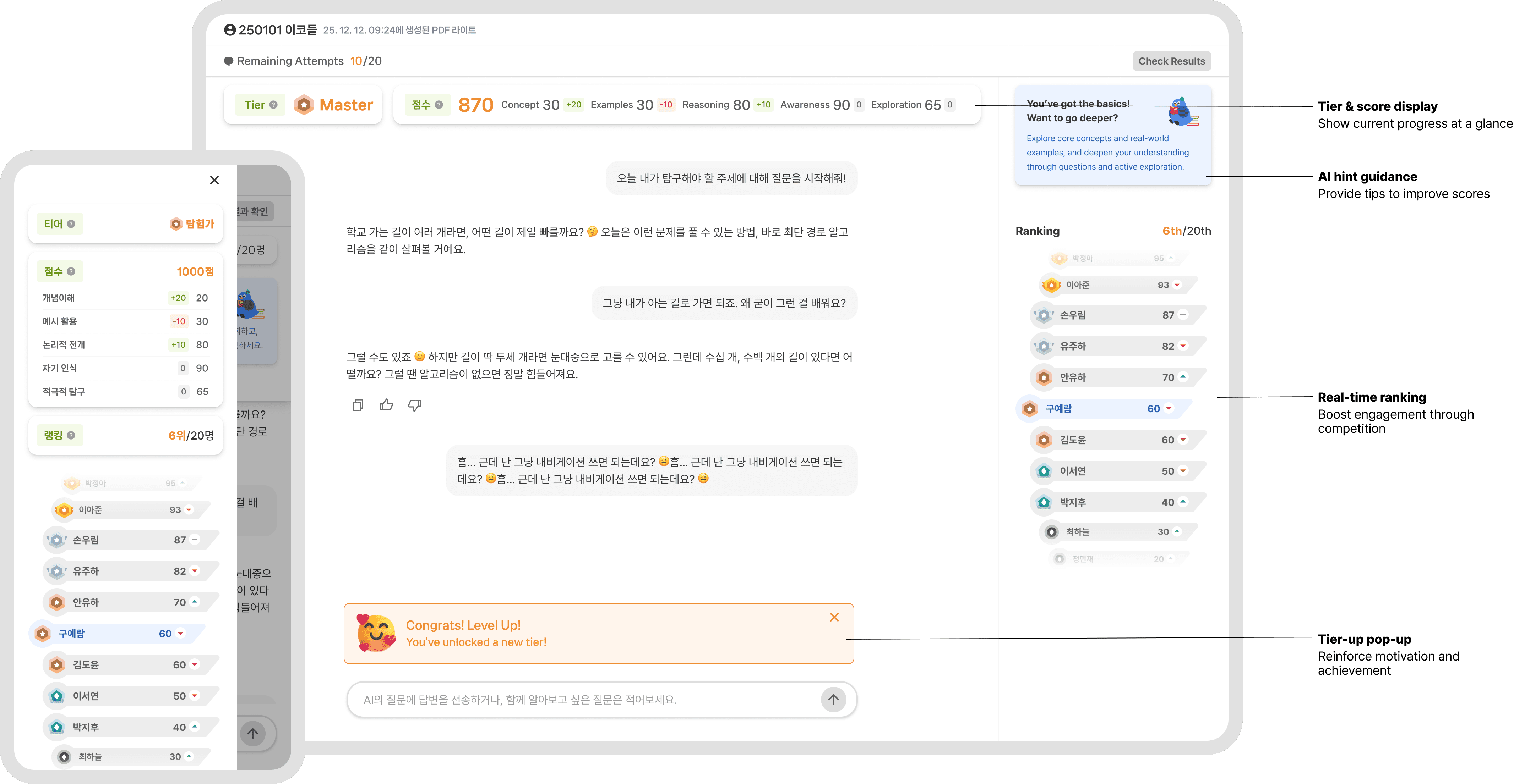 Based on the insight that students are more engaged when appropriate encouragement and rewards are provided, we introduced gamification elements and a mobile-friendly interface.