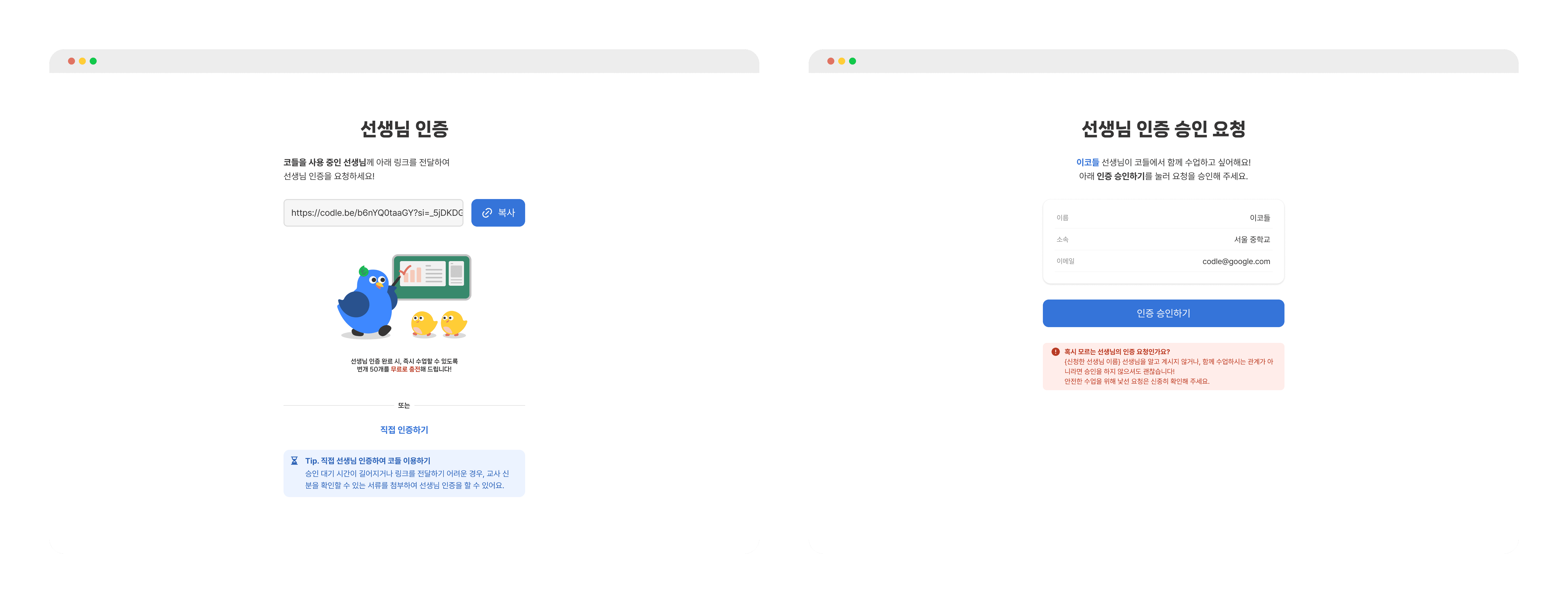 Analysis showed that over 80% of newly registered teachers in the past six months discovered Codle through other teachers. Based on this insight, we introduced a peer verification approach that allows teachers who have already completed verification to approve new teachers, enabling immediate access to the service.